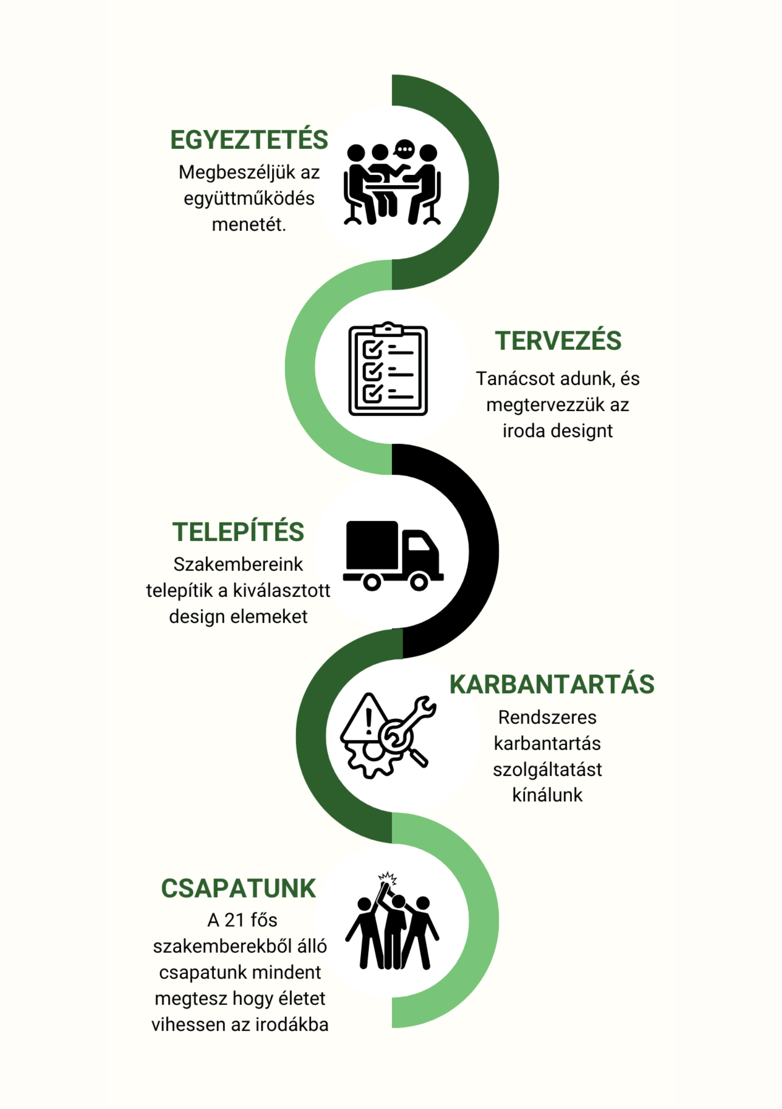Így alakult ki a mai, teljeskörű portfoliónk. Folyamatosan bővítjük azt a szolgáltatás listát amellyel segíthetünk életet varázsolni a munkahelyekre. Ma már nemcsak növényekkel, hanem faldekorációval, design bútorokkal, hang- és illatrendszerekkel, bérelhető műtárgyakkal és textíliákkal is foglalkozunk. Számunkra az iroda, a szálloda vagy az étterem nem pusztán egy munkatér, hanem egy olyan közeg, amely befolyásolja az ott dolgozók és vendégek hangulatát, teljesítményét és közérzetét.